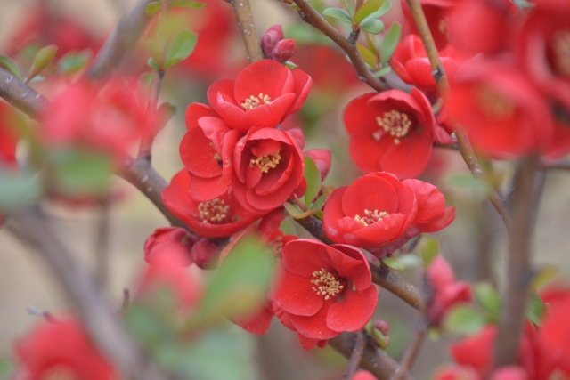 ボケの花の色をシンプルに思い浮かべてください。まだまだ寒さが続く中ボケは「赤」の花を見せてくれます。